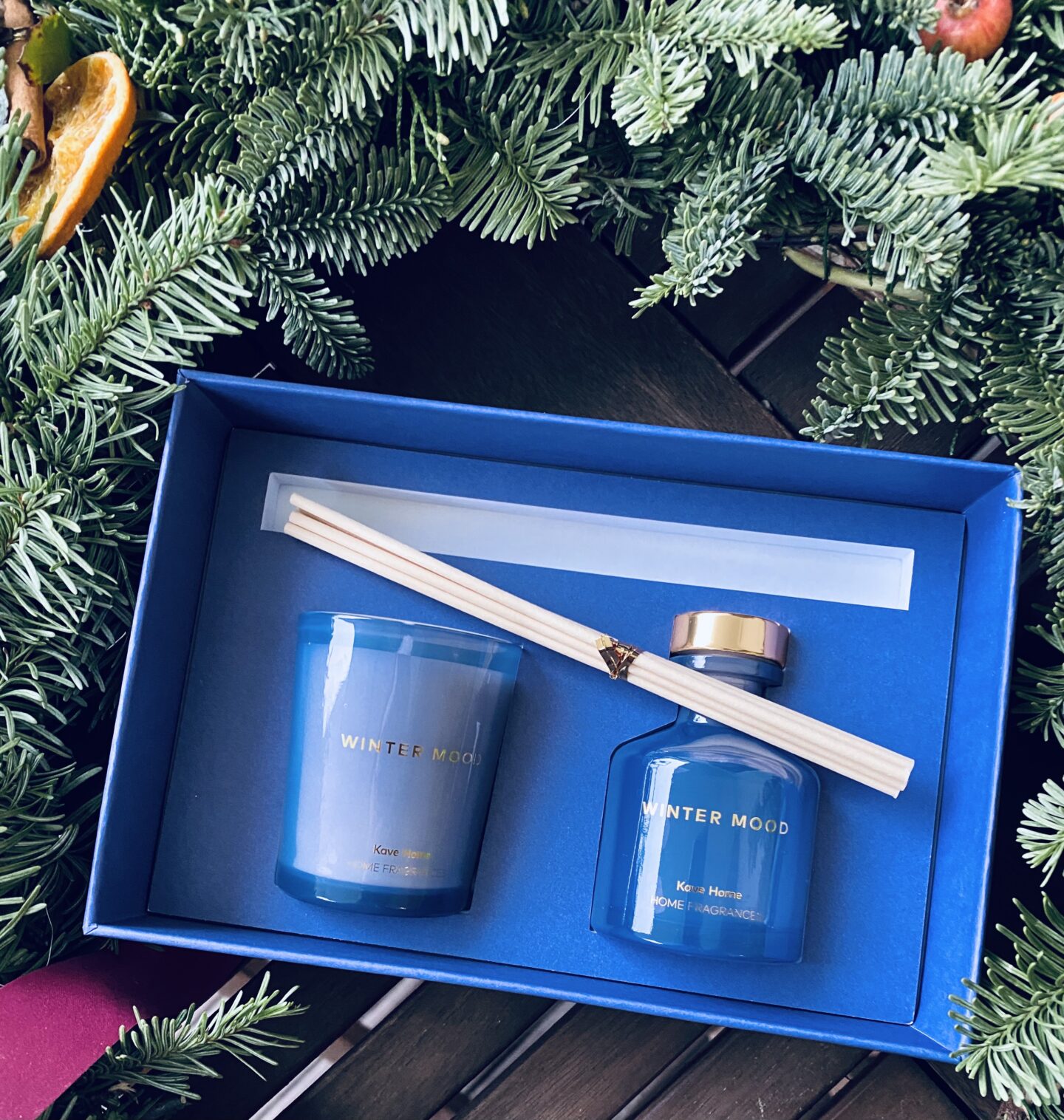 Świeca i dyfuzor zapachowy o magicznym aromacie o nazwie „Winter Mood”. Pachnie zimą, zapowiedzią ciepłego, otulającego wieczoru. I pięknie wygląda. Pojemnik i pudełko wykonano z matowego szkła, które można ponownie wykorzystać lub poddać recyklingowi, a to zawsze doceniamy.