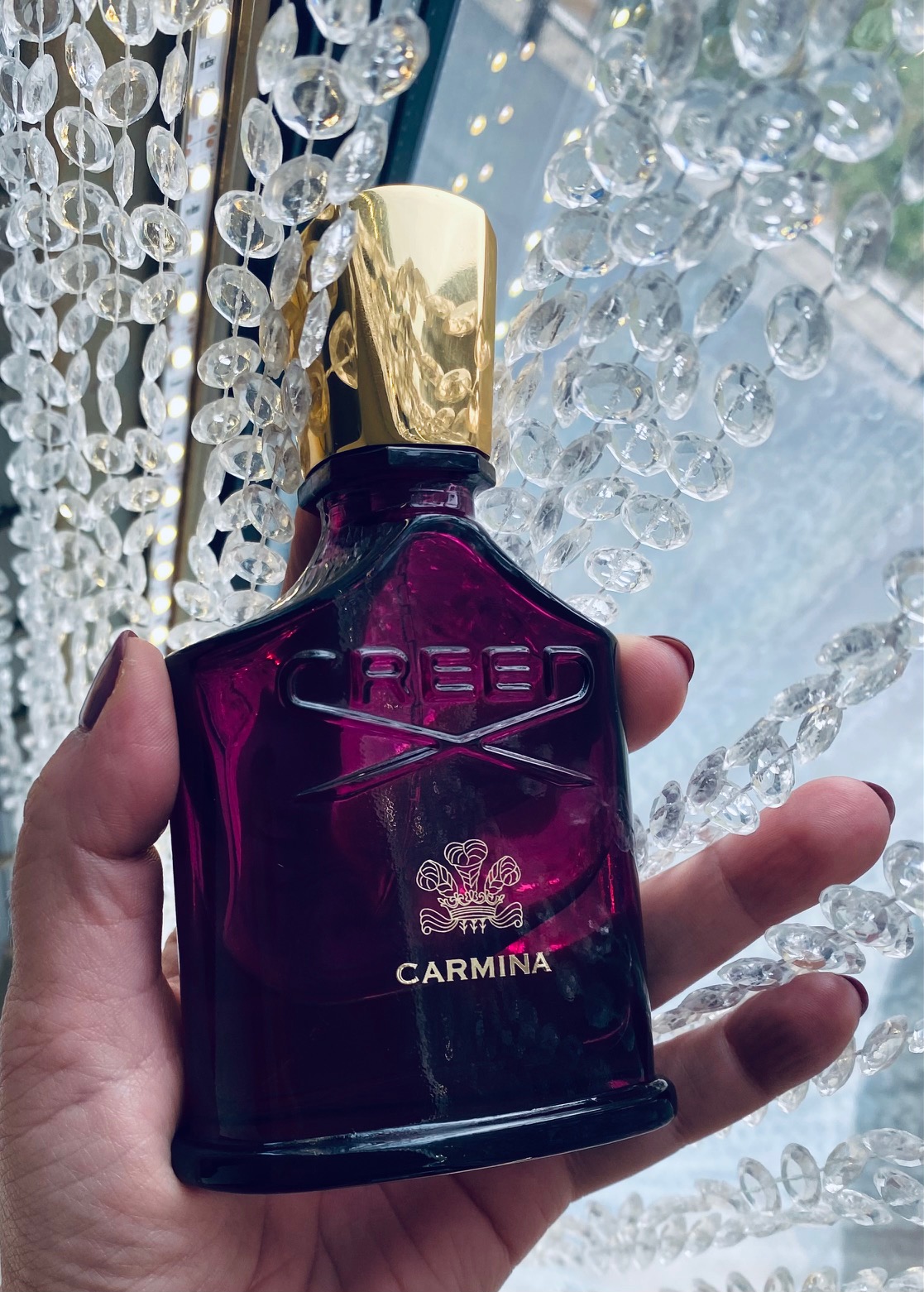 Idzie zima. Znowu zakochałam się w ciepłym otulającym zapachu róży, piżma i drzew. Carmina marki Creed od razu zatrzymuje. Jest totalnie soczysta i zmysłowa. Bardzo kobieca. Fioletowy flakon w każdym świetle wygląda nieco inaczej. Sam zapach najpierw pokazuje świeże i soczyste oblicze (nutami głowy są różowy pieprz, czereśnia i szafran), potem łagodnieje (w sercu jest róża, piwonia, fiołek i drzewo kaszmirowe) a na koniec, w nucie bazy, pokazuje swoje poważne, zimowe oblicze i wtedy właśnie otwiera się przed nami mirra, piżmo, ambroksan i kadzidło.